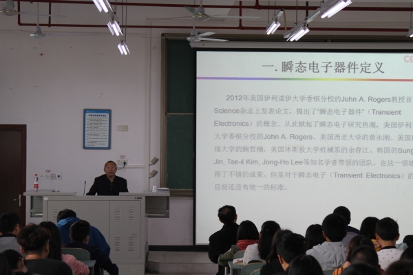 张正元教授围绕“瞬态电子器件发展现状”这一主题,向同学们介绍了专业的前沿动态,他鼓励同学们站在国家需求的高度来看待和认识问题。瞬态电子器件作为近几年才提出的新概念器件,是未来信息安全技术的主要解决方案之一,通过张教授的讲解,同学们对专业的认识更加深入。