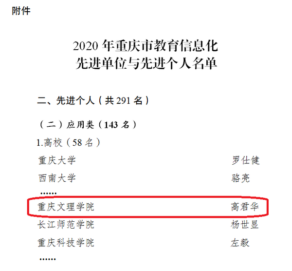 近日,重庆市教育委员会发布了《重庆市教育委员会关于2020年教育信息化先进单位和先进个人评选结果的通报》(渝教科函〔2020〕18号),公司青年教师高君华依托云班课、云教材开展智能化教学,成绩突出,荣获应用类先进个人。