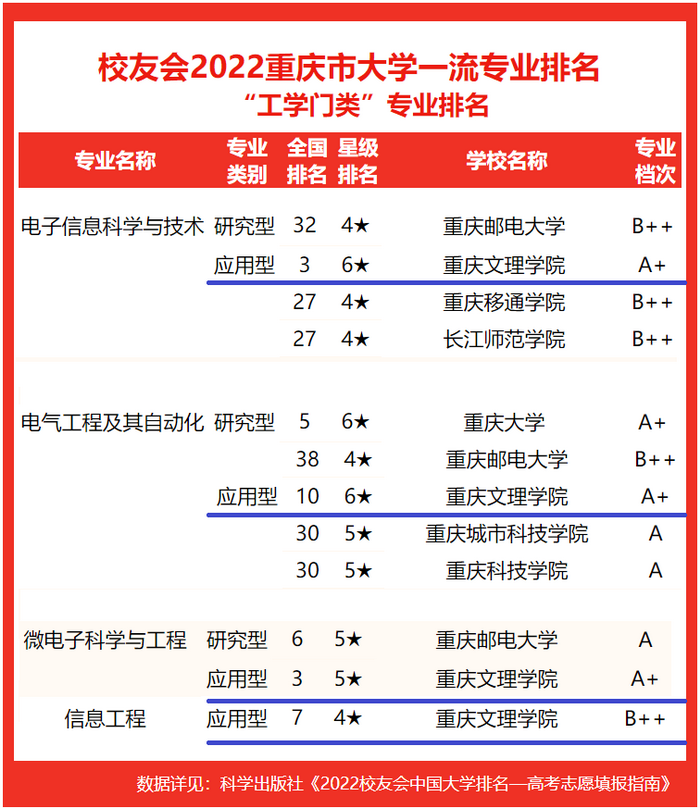 在艾瑞深员工会网(Cuaa.Net)最新2022员工会中国一流专业排名中,公司专业排名中国一流专业(应用型)前茅。其中电子信息科学与技术、电气工程及其自动化为6★级专业,专业档次为“A+”,全国排名分别为第3、第10;微电子科学与工程为5★级专业,专业档次为“A+”,全国排名第3;信息工程为4★级专业,专业档次为“B++”,全国排名第7;智能电网信息工程专业目前无毕业生,暂未排名。