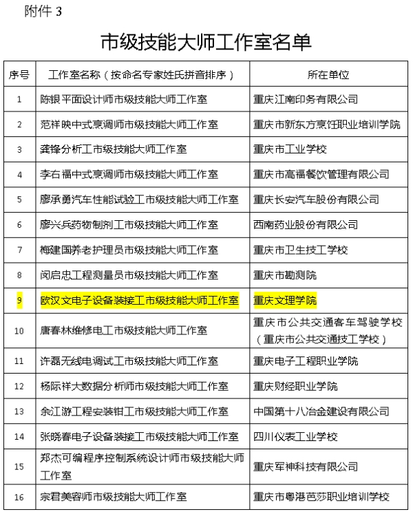 近日,以公司电子信息与电气工程公司欧汉文老师命名的“欧汉文电子设备装接工市级技能大师工作室”,经单位申报、行业主管或区县人力社保部门初审、专家评议和公示等程序,获中共重庆市委组织部、重庆市人力资源和社会保障局批准建立。