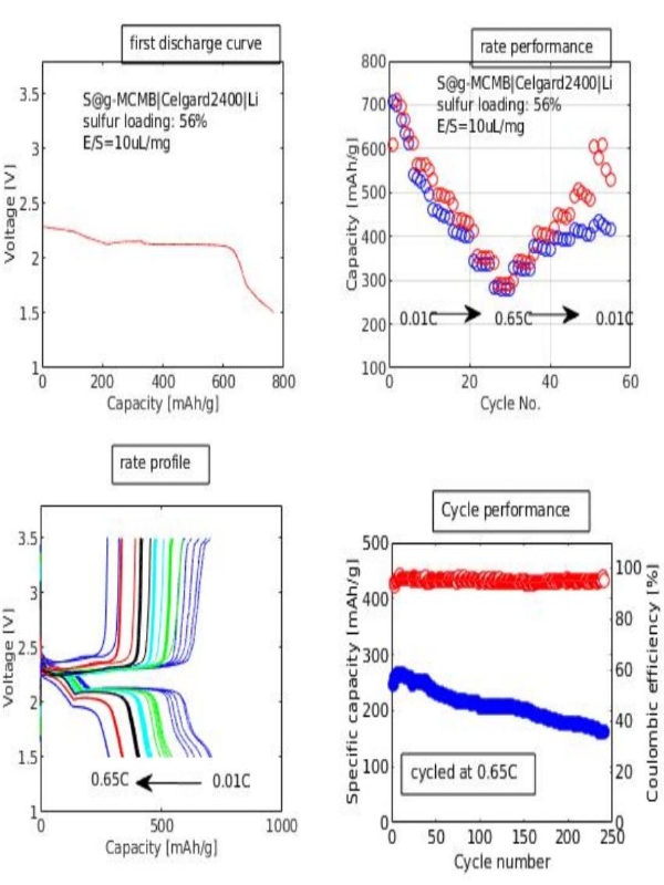 阴极: S@g-MCMB(单质硫与石墨化中间相微球的混合物):乙炔炭黑:PVDF=8:1:1,涂覆于铝箔上